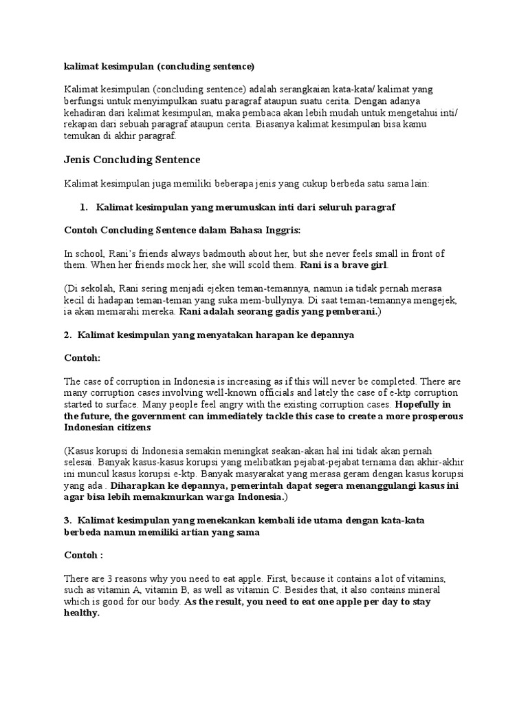 Contoh kalimat efektif adalah baik mahasiswa baru atau mahasiswa lama dikenakan peraturan yang sama dan masih ada 40+ contoh. Contoh kalimat generalisasi dan kesimpulannya. Tahapan penelitian meliputi pengumpulan data, penganalisisan data, dan penyimpulan hasil analisis. Untuk menunjukkan kalimat kesimpulan tersebut, perlu memberikan kalimat mauapun kata yang ketika orang membacanya akan mengetahui. Contoh kalimat kesimpulan (concluding sentence dalam bahasa inggris).